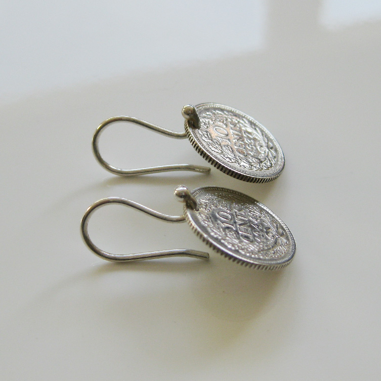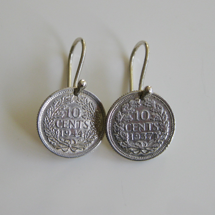 In de serie “oud geld” deze oorbellen gemaakt van echte oude zilveren dubbeltjes. Eén uit 1937 en één uit 1944. De dubbeltjes bewegen aan de oorhaken.