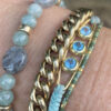 Links: armband op elastiek van groene jade, grijze kyaniet en gouden tussenstukjes