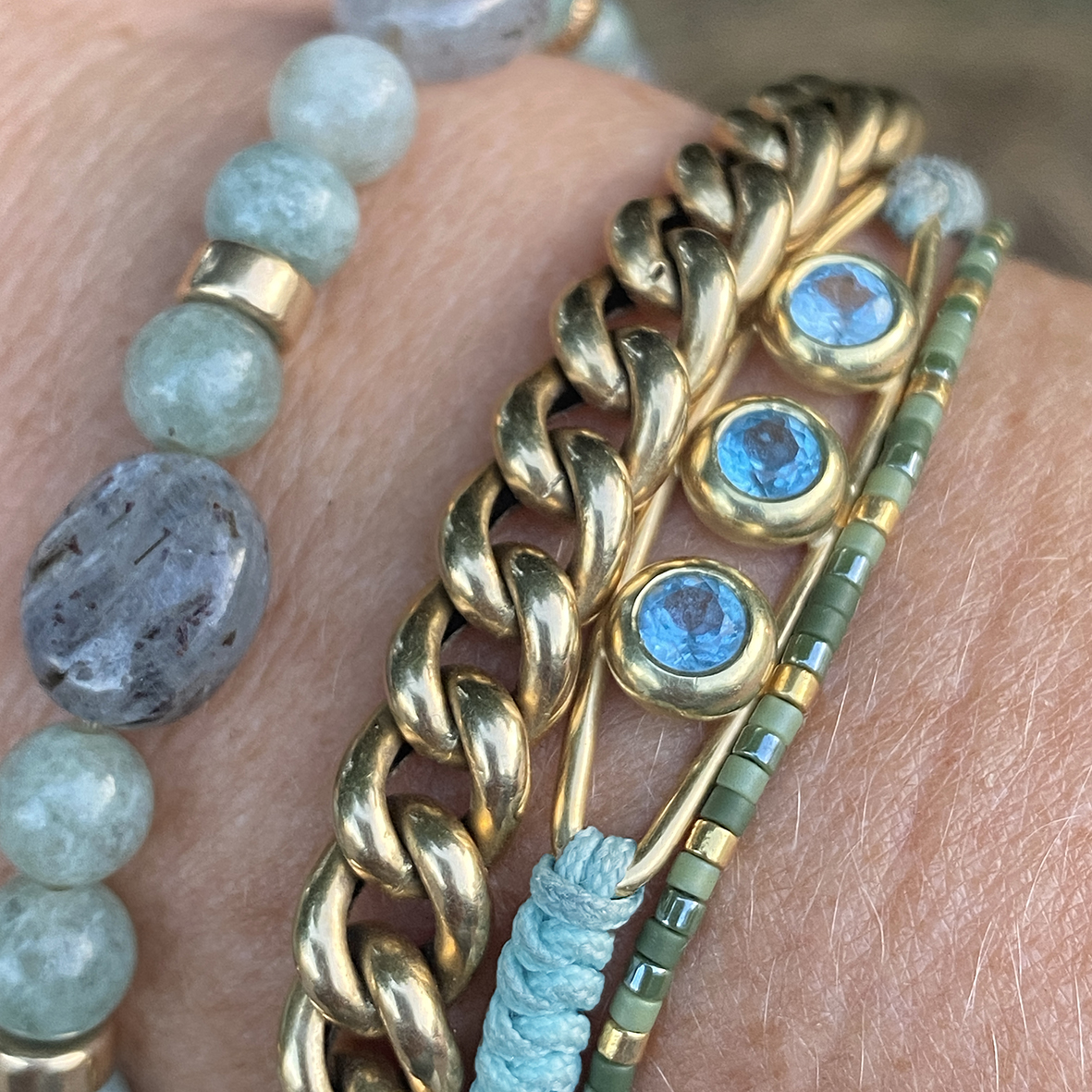 Daarnaast blauwe koordarmband met goud tussenstuk met daarin 3x topaas